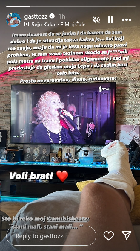 „Imam dužnost da se javim i da kažem da sam dobro i da je situacija takva kakva je… Svi koji me znaju, znaju da mi leva noga odavno pravi problem, te sam svom težinom skočio sa j*****h pola metara na travu i pokidao ligamente. Sad mi preostaje da gledam moju Lepu i sedim kući celo leto. Prosto neverovatno, divno, čudnovato! Voli brat„, napisao je Gastoz.