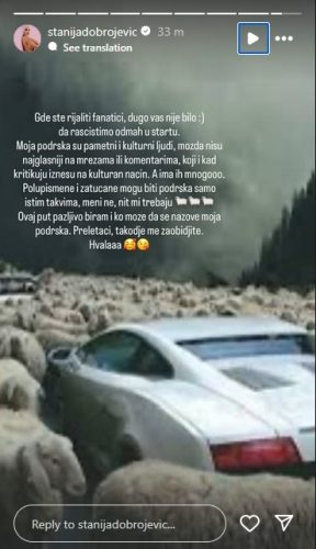 – Gde ste rijaliti fanatici, dugo vas nije bilo. Da rasčitimo odmah u startu. Moja podrška su pametni i kulturni ljudi, možda nisu najglasniji na mrežama ili komentarima, koji i kad kritikuju iznesu na kulturan način. A ima ih mnogo. Polupismene i zatucane mogu biti podrška samo istim takvim, meni ne, niti mi trebaju ovde. Ovaj put pažljivo biram i ko može da se nazove moja podrška. Preletači, takođe zaobiđite me. Hvala – završila je Stanija.