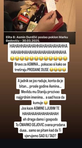 – Bravo za Asmina, pokazao si kako se tretiraju prodane duše. A jadnik još je raduje, konta da je bitan. Prošle godine Asminam Mevlidu mu Staniju prozivao najgrdnijim imenima, a sad hoće da kumuje. Još kaže Asmine ljubim te, eh draga damo i gospodo. To Ćmarko Gejović zvana prodana duša. Samo se pitam kad da ti verujemo sad ili tad? – završila je Ermina.