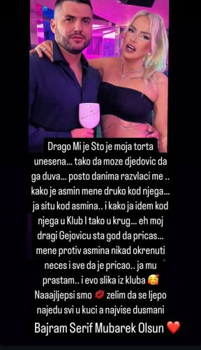 – Drago mi je što je moja torta unešena. Tako da može Đedović da ga duva, pošto me danima razvlači. Kako je Asmin mene drukao kod njega, a ja Situ kod Asmina i kako ja idem kod njega u klub i tako u krug. Ej moj dragi Gejoviću šta god da pričaš mene protiv Asmina nikad okrenuti nećeš i sve da je pričao. Ja mu praštam. Evo slike iz kluba, najlepši smo. Želim da se lepe najedu svi u kući, a najviše dušani – napisala je Ermina i dodala.