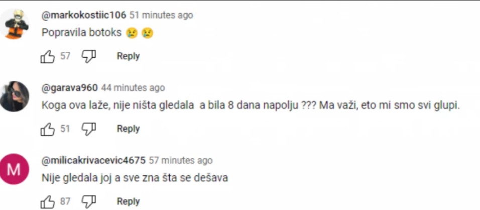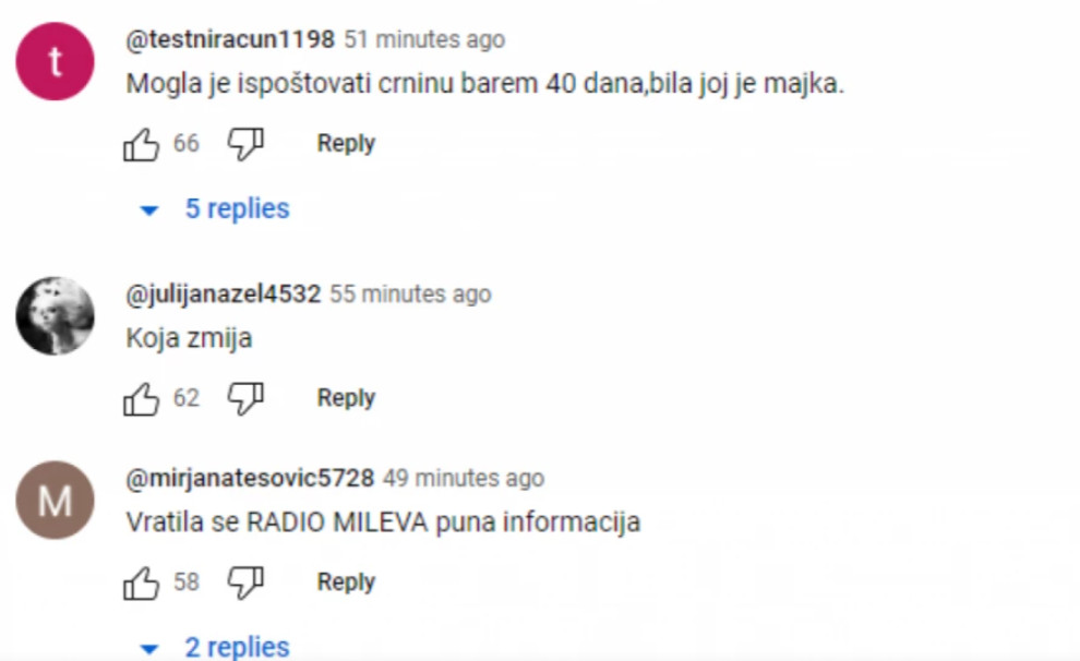 „Da li je ova radila usta? SAD!!! O, moj Bože“, „Popravila botoks“. Koga ova laže, nije ništa gledala, a bila osam dana napolju? Ma važi, eto mi smo svi glupi“, „Nije gledala joj, a sve zna šta se dešava“, „Mogla je da ispoštuje crninu barem 40 dana, bila joj je majka“, „Koja zmija“, „Vratila se radio Mileva puna informacija“, „Bitno da je pumpala usta, Bože sačuvaj“, samo su neki od komentara ispod raznih objava.