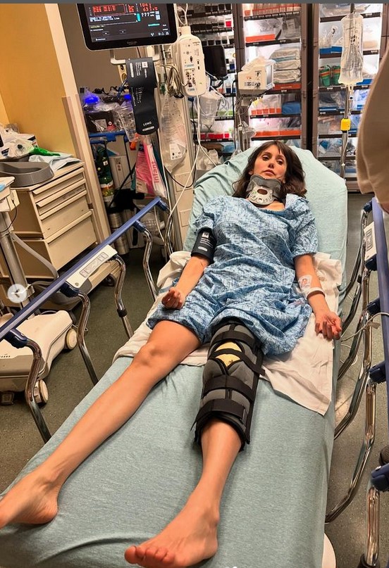 Zvezda „Vampirskih dnevnika“ objavila je dve fotografije – jednu na kojoj se sprema za vožnju dok sedi na biciklu i drugu iz bolničke postelje sa kragnom i steznikom za kolena.