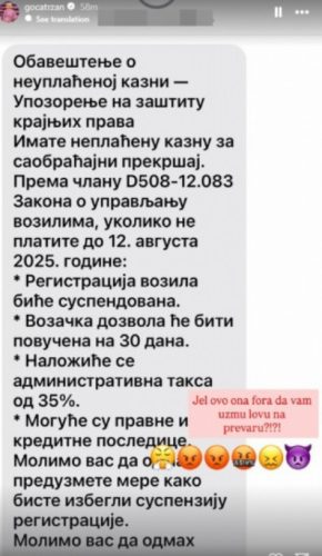 – Obaveštenje o neuplaćenoj kazni Upozorenje na zaštitu krajnjih prava Imate neplaćenu kaznu za saobraćajni prekršaj. Prema članu D508-12.083 Zakona o upravljanju vozilima. Ukoliko ne platite do 12. avgusta 2025. godine: registracija vozila biće suspendovana, vozačka dozvola će biti povučena na 30 dana. Naložiće se administrativna taksa od 35 odsto, moguće su pravne i kreditne posledice. Molimo vas da odmah preduzmete mere kako biste izbegli suspenziju registracije. Molimo vas da odmah platite – piše u poruci koja je stigla pevačici.