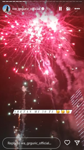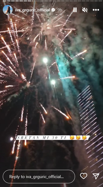 Iva je sinoć u ponoć napunila 30 godina, a Nemanja joj je priredio romantično iznenađenje. Osim večere u jednom poznatom prestoničkom restoranu, gde je uživala u đakonijama i šampanjcu, Iva je dobila i spektaluaran vatromet, koji je obasjao nebo iznad Kule Beograd. Grgurićeva je ovo iznenađenje podelila sa svojim pratiocima na društvenoj mreži Instagram.