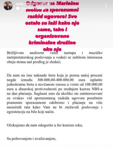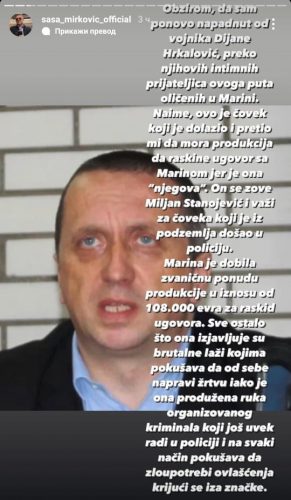 – Obzirom, da sam ponovo napadnut od vojnika Dijane Hrkalović, preko njihovih intimnih prijateljica ovoga puta oličenih u Marini. Naime, ovo je čovek koji je dolazio i pretio mi da mora produkcija da raskine ugovor sa Marinom jer je ona „njegova“. On se zove Miljan Stanojević i važi za čoveka koji je iz podzemlja došao u policiju. Marina je dobila zvaničnu ponudu produkcije u iznosu od 108 000 evra za raskid ugovora. Sve ostalo što ona izjavljuje su brutalne laži kojima pokušava da od sebe napravi žrtvu iako je ona produžena ruka organizovanog kriminala koji još uvek radi u policiji i na svaki način pokušava da zloupotrebi ovlašćenja krijući se iza značke.