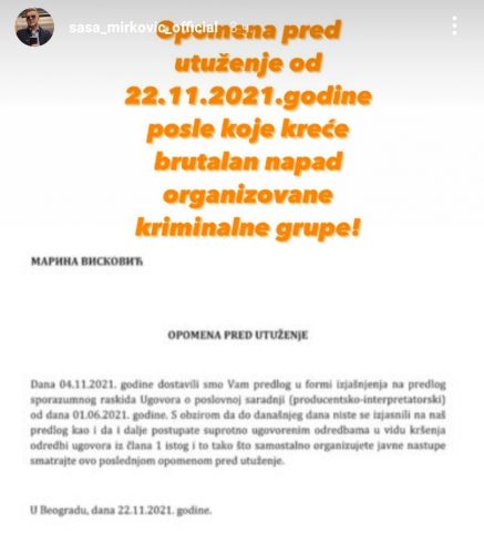 Nakon višenedeljnih pokušaja Viskovićeve da ugovor sa „HYPE“ produkcijom čiji je direktor Saša Mirković, raskine bez obeštećenja uz pritisak i pretnje Mirkoviću od različitih ljudi bliskih pevačici poznati menadžer i producent je obelodanio kako stoje stvari između njega i Marine Visković putem svog zvaničnog Instagram naloga.