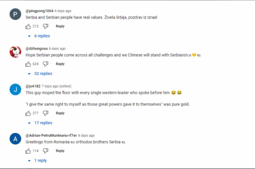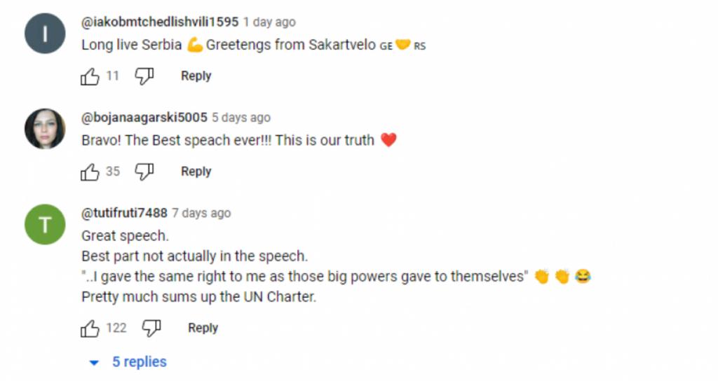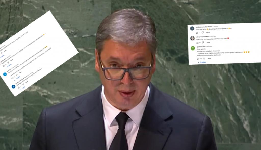 Govor predsednika Srbije objavljen je na zvaničnom kanalu Ujedinjenih nacija na Jutjubu, a u komentarima ispod snimka nižu se reči podrške, ali i oduševljenja iz celog sveta upućene predsedniku Vučiću.
