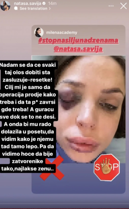– Oglašavam se na Instagramu? Pa ne oglašavam se baš toliko kao u početku kad sam mislila da je brzo kraj svemu, ali kad vidim ovo što priča, ne mogu da se ne iznerviram, jer znam kroz šta sam prošla, kolika je težina preloma (reči doktora) i šta me još tek čeka. Uostalom slika govori više od 1.000 reči, koliko je smrskana jagodična kost da mi je ovoliko pao donji kapak. Ja bih mogla knjigu da napišem kad bih detaljno pričala kroz šta sam prošla i kakvo je stanje. Jedino sam zahvalna ‘umetniku’ što nije malo višlje bio udarac, jer da jeste (isto reči doktora) ostala bih bez oka 100 posto, s obzirom na silinu udarca. Tako da ipak malo sreće u svemu ovome i takođe što mu onaj pištolj, koji je posedovao zaplenjen na vreme. Dakle, gospodinov sin me unakazio, pa maltene i ubio i gospodin se ljuti, jer sam u bolnici i što se oglašavam na Instagramu (sreća, nije mi ruke polomio) pa ne dolazim na sud, jer njegov sin, Bože moj se muči tamo i ne može da živi kako je navikao, a to što se ja vučem po bolnicama, imam bolove, izdeformisano oko, prolazim kroz pakao, pa zar je važno – završava Šavija.