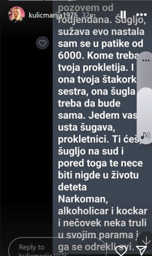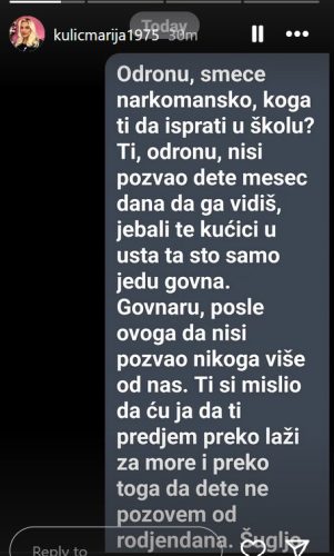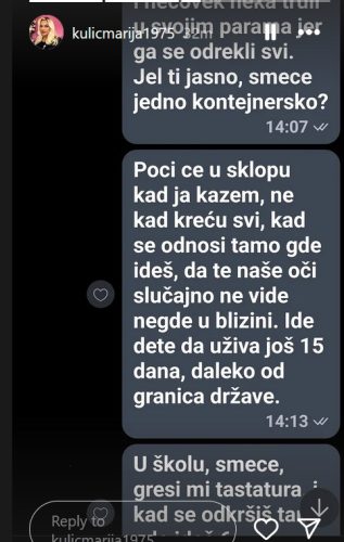 – Odronu, smeće narkomansko, koga ti da ispratiš u školu? Ti, odronu, nisi pozvao dete mesec dana da ga vidiš je*ali te kučići u ista ta što samo jedu g**na. Go**aru, posle ovoga da nisi pozvao nikoga više od nas. Ti si mislio da ću ja da ti pređem preko laži za more i preko toga da dete ne pozoveš od rođendana. Šugljo šugava evo nas**la sam se u patike od 6.000 dinara. Kome treba tvoje prokletija?