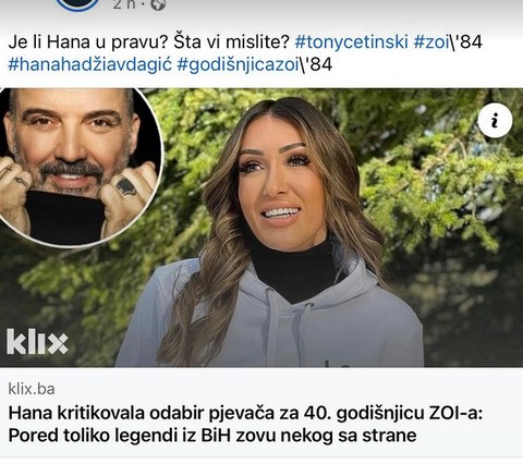 – Baš me zanima da li bi iko iz Srbije ili Hrvatske za ovakvo dešavanje pozvao pevača koji nije iz njihove zemlje… evo odgovoriću vam – nikada! Pored toliko mladih perspektivnih pevača iz BiH i živih legendi, ti zoveš nekoga sa strane za obeležavanje 40 godina ZOI-a? Šta je s glavom? No comment – napisala je Hana.