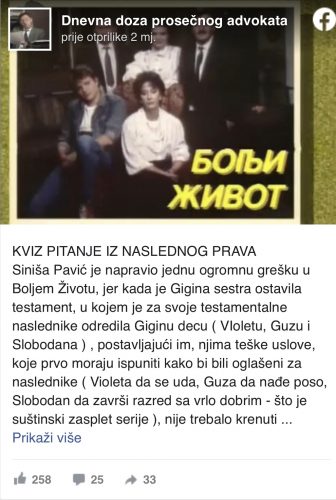 Naime, kako se navodi na toj Fejsbuk stranici, kada je Gigina sestra ostavila testament, u kojem je za svoje testamentalne naslednike odredila Giginu decu ( VIoletu, Guzu i Slobodana), postavljajući im, njima teške uslove, koje prvo moraju ispuniti kako bi bili oglašeni za naslednike ( Violeta da se uda, Guza da nađe posao, Slobodan da završi razred sa vrlo dobrim – što je suštinski zaplet serije), nije trebalo krenuti putem ostvarivanja tih postavljenih uslova, već su testamentalni naslednici jednostavno mogli da se ne prihvate nasledstva.