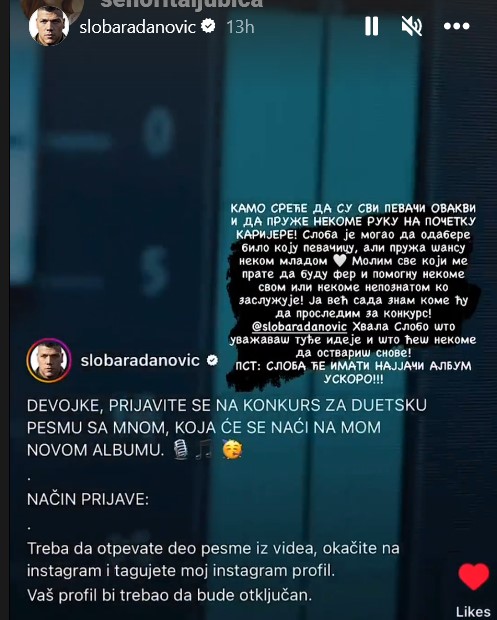 – Devojke, prijavite se na konkurs za duetsku pesmu sa mnom, koja će se naći na mom novom albumu. Način prijave: Treba da otpevate deo pesme iz videa, okačite na instagram i tagujete moj profil. Vaš profil bi trebao da bude otključan – napisao je pevač i tako pozvao sve mlade i neafirmisane, a talentovane devojke.