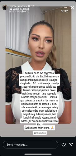 „Ne želim da se ovo pogrešno protumači, niti bilo šta. Želim samo da dam podršku svakome ko je „osuđen“ zbog tuđih laži i uništio svoje zdravlje zbog neke tamo osobe koja je bez trunke razmišljanja iznela takvu neistinu u javnost i time napravila nekome ozbiljan problem. U kakvom god odnosu da smo Ana i ja, ja sam na neki način dužan da stanem u njenu odbranu zato što je ona majka našeg deteta i zato što znam celu istinu o ovoj situaciji. I da napomenem, bez ikakvih insinuacija vezano za naš odnos, jer ovo nema nikakve veze sa tim. Svako dobro želim svima“, napisao je Mirče u poruci na storiju uz Anin snimak gde se obratila svima.