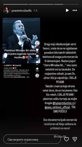 – „Dragi moji višedecenijski verni fanovi, znate da se ne oglašavam povodom bilo kakvih tabloidnih tekstova. Ali ovoga puta moram da ih demantujem. Naslovi poput „Umro Miroslav Ilić“… nisu samo neistiniti. Oni su bezdušni. Da razjasnimo odmah, ja sam živ, zdrav. I što je najvažnije: I DALJE PEVAM„, započeo je Ilić.