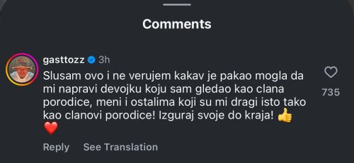 – Slušam ovo i ne verujem kakav je pakao mogla da mi napravi devojku koju sam gledao kao člana porodice, meni i ostalima koji su mi dragi, isto tako kao članovi porodice! Izguraj svoje do kraja! Da dodam, i članovima porodice – napisao je Gastoz.