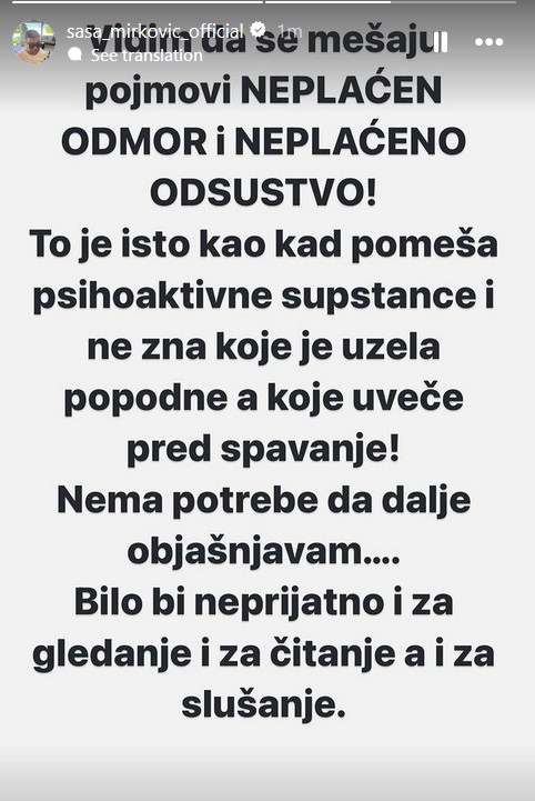 – Vidim da se mešaju pojmovi neplaćen odmor i neplaćeno odsustvo! To je isto kao kad pomeša psihoaktivne supstance i ne zna koje je uzela popodne a koje uveče pred spavanje! Nema potrebe da dalje objašnjavam… Bilo bi neprijatno i za gledanje i za čitanje a i za slušanje – napisao je na svom Instagram profilu direktor i vlasnik Hype televizije.