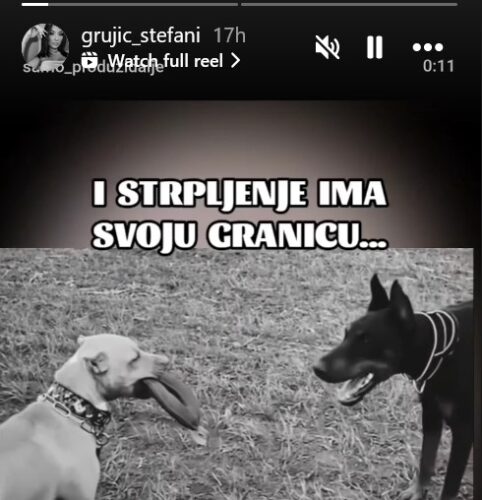 Ona je na svoj instagram postavila sliku dva psa uz komentar : „I strpljenje ima svoju granicu…“. Naravno odmah su krenuli komentari, da li je ta rečenica bila upućena Matoroj ili Munjezu?