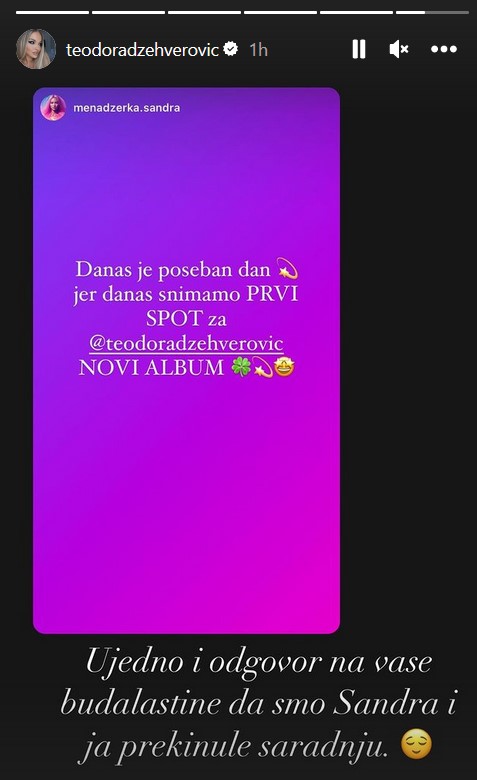 – Danas je poseban dan, jer danas snimam prvi spot za novi album. Ujedno i odgovor na vaše budalaštine da smo Sandra(menadžerka) i ja prekinule saradnju – napisala je Teodora na svom instagramu i tako svima zapušila usta o nagađanjima o raskidu saradnje.