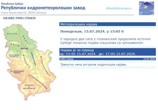 Republički hidrometeorološki zavod (RHMZ) oglasio se u 15 časova najnovijom najavom.