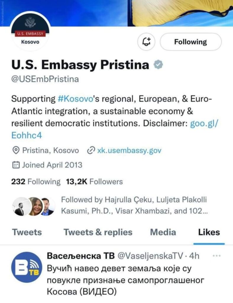 Tviter profil Ambasade SAD u Prištini lajkovao je sinoć objavu „Vaseljenske TV“ u kojoj je predsednik Srbije Aleksandar Vučić poručio da je devet zemalja povuklo priznanje samoptoglašene nezavisnosti Kosova.