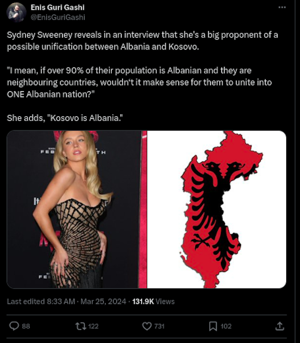 Sidni Svini je navodno, baš kao što smo gore napisali (sudeći prema objavama na društvenoj mreži „X“), govorila o Kosovu i Metohiji.