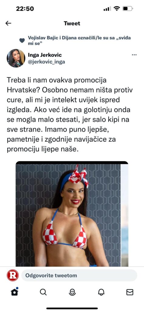 Imamo puno ljepše, pametnije i zgodnije navijačice za promociju lijepe naše” ili “Pitali je neki dan da nabroji 3 naša igrača mučenica nije uspjela…nikad ovakvu promociju neće dobiti intelektualna i pametna djevojka…” padaju u vodu, zato što je cura došla ispromovisati se i marketing joj odlično ide!
