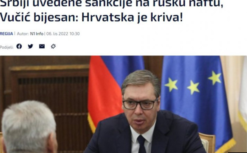 Kampanja hrvatskih medija protiv Srbije i predsednika Aleksandra Vučića danas je dotakla dno. Hrvatski portal N1 plasirao je izmišljenu Vučićevu izjavu povodom usvajanja osmog paketa sankcija EU protiv Rusije, kojoj je, između ostalog, na insistiranje Hrvatske, zabranjen transport ruske nafte za Srbiju preko naftovod JANAF