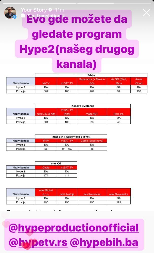 Takođe, ako ste u Bosni i Hercegovini, Crnoj Gori ili Austriji, Nemačkoj, Švajcarskoj glavni i odgovorni urednik i direktor Hype produkcije Saša Mirković objavio je na svom Instagram profilu na kojim kanalima možete gledati Hype 2 televiziju.