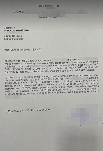 – Poštovani gospodine Janjušević, obraćam vam se u zastupanju gospođe (ime poznato redakciji) iz Zagreba, koja me je ovlastila da vam uputim ovaj dopis koji možete smatrati opomenom pred utuženje. Naime, od gospođe (ime poznato redakciji) uzeli ste u zajam novčani iznos od 2,000 evra, u periodu od 08,05,2022, godine do 05,07,2022, godine sa rokom povrata najkasnije do dana 31,07,2022, godine. Obzirom, da je rok povrata pozajmljenog iznosa protekao, ovim putem vas pozivam da pozajmljeni iznos u visini od 2,000 evra isplatite gospođi (ime poznato redakciji) najkasnije 25,08,2022, godine, ili će u suprotnom ista biti prinuđena pokrenuti sudski postupak radi povrata navedenog iznosa, a što že vam prouzrokovati dodatne, a nepotrebne troškove. Sudski postupak ići će u dva smera i to jedan kao civilna tužba, radi povrata iznosa od 2,000 evra, a drugi u kaznenom smeru, podnošenjem kaznene prijave radi počinjenog kaznenog dela prevare na štetu gospođe (ime poznato redakciji).
