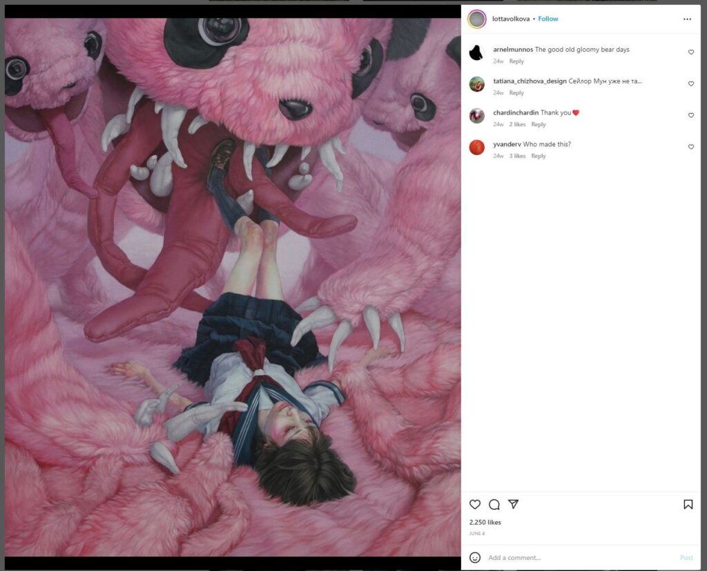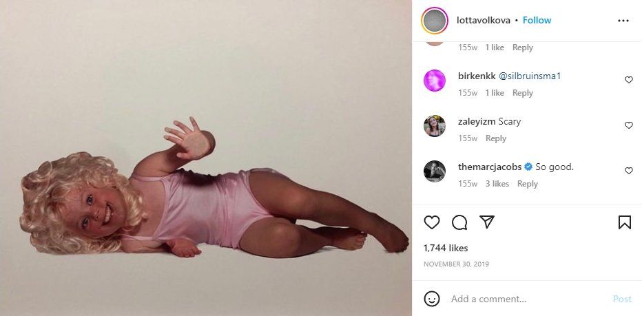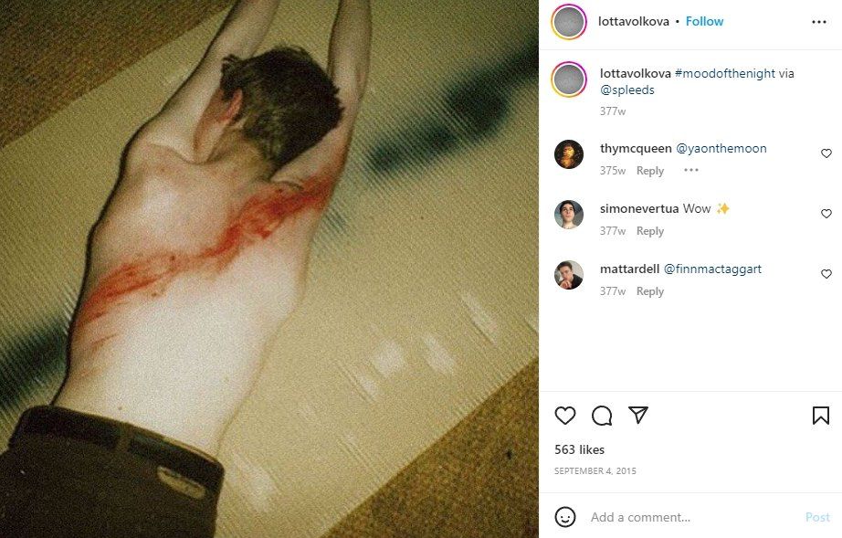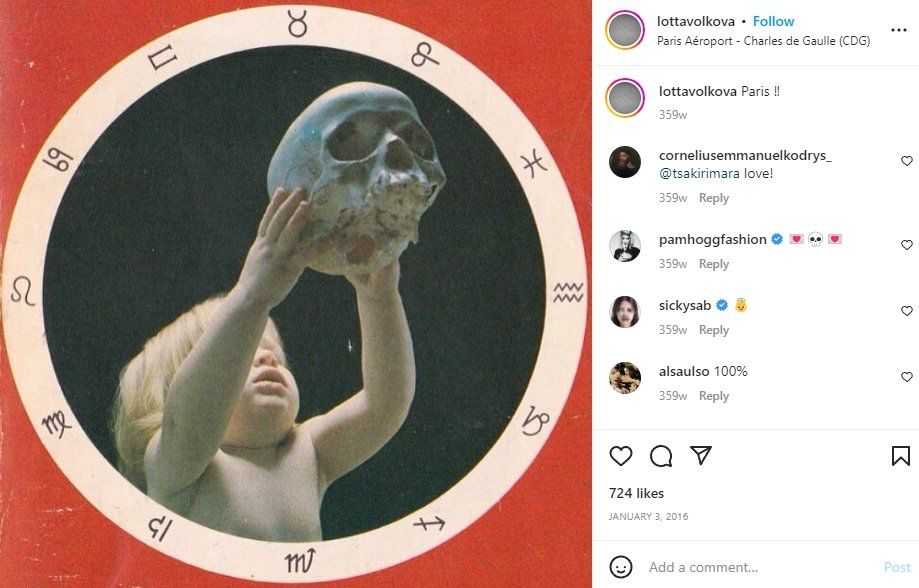 Njen Instagram obiluje boleštinama; muškarac i žena umotani su u plastične vrećice i zagrljeni, žena koja kao da se žrtvuje za „vraga“, zatim dete koje drži lobanju, slika devojke koja drži celofansku traku preko usta i očiju…