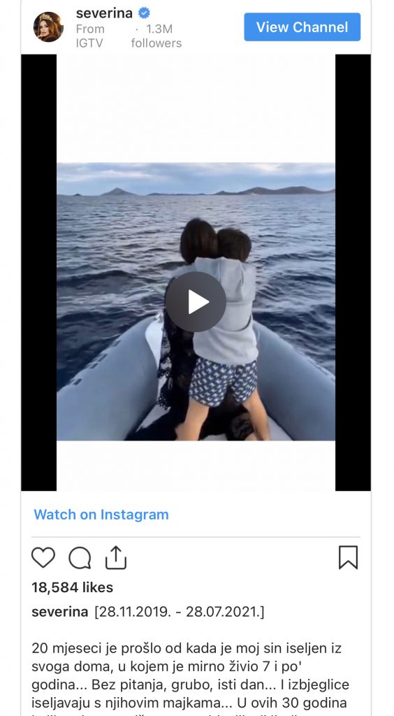 „Dvadeset meseci je prošlo od kada je moj sin iseljen iz svog doma, u kojem je mirno živeo sedam i po godina… Bez pitanja, grubo, isti dan… I izbeglice iseljavaju s njihovim majkama. U ovih trideset godina koliko pevam više su me objavljivali ljudi sa svojom decom, nego što sam ja objavila fotografija sa svojim detetom. Ne kao Severina, nego kao ponosna mama. To mi je zabranjeno pa vam poklanjam pesmu sa Zagrepčankama i dečacima… Hvala svima na podršci“, napisala je vidno tužna Severina, a brojne poznate ličnosti, kao i armija fanova, uputili su joj reči podrške.
