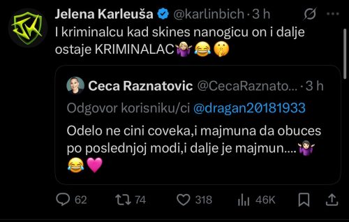 – Odelo ne čini čoveka, i majmuna da obučeš po poslednjoj modi i dalje je majmun – poručila je Ražnatovićka Jeleni.