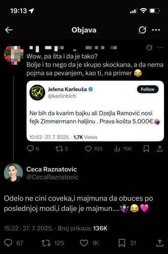 Pop diva Jelena Karleuša i srpska maćeha Ceca Ražnatović ušle su u sukob preko društvene mreže „X“. Sve je počelo naizgled bezazlenom opaskom, ali se vrlo brzo pretvorilo u pravi verbalni obračun, koji je zapalio društvene mreže.