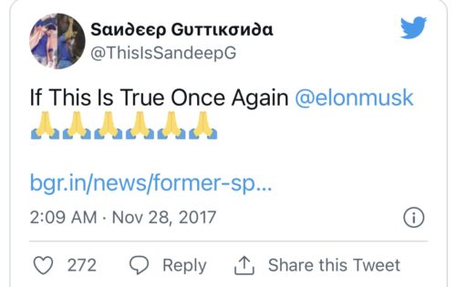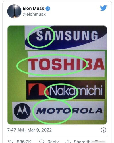 U tvitu, Mask je podelio sliku koja sugeriše da je pseudonim Satoši Nakamoto jednostavno kombinacija slogova brendova četiri tehnološke kompanije: „Sa“ iz Samsunga, „Toshi“ iz Tošibe, „Naka“ iz Nakamičhija i „ Moto” iz Motorola.