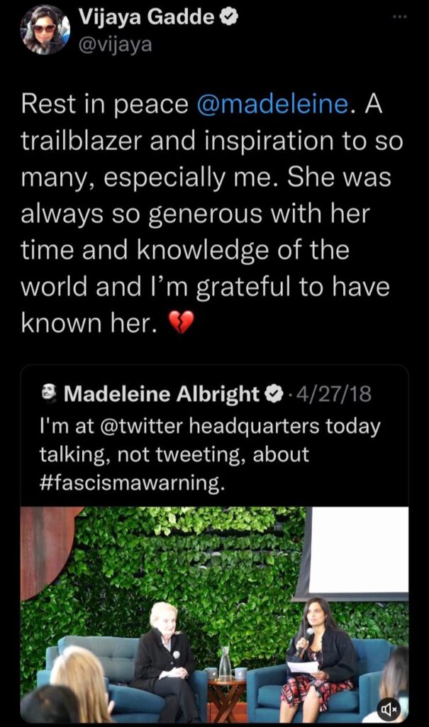 Zanimljivo je da je Vijaya Gadde bila stipendista i prijatelj sa Madlen Olbrajt.