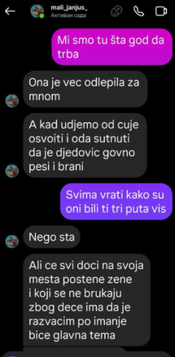 – Nego šta. ali će svi doći na svoja mesta, poštene žene i koji se ne brukaju zbog dete, ima da je razvlačim biće glavna tema – napisao je Janjuš.