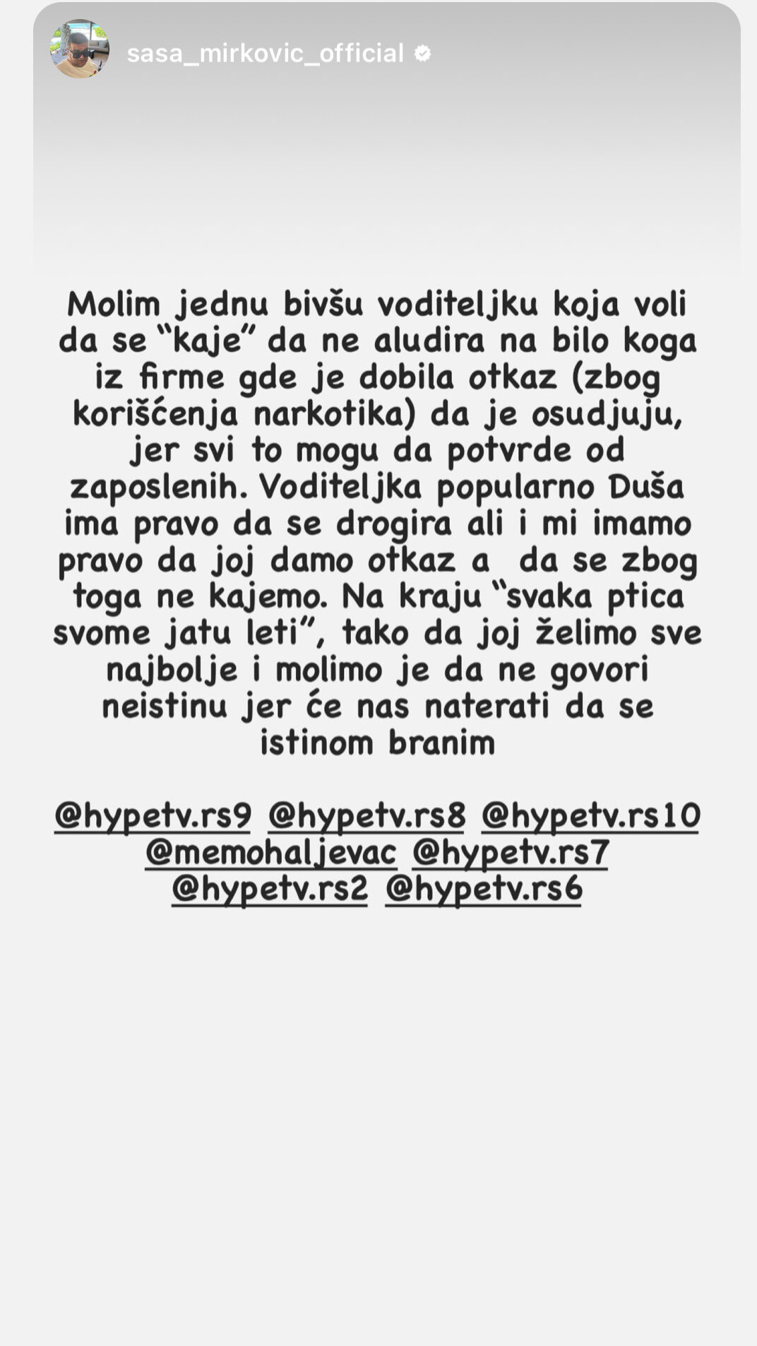 “Molim jednu bivšu voditeljku, koja voli da se kaje. Da ne aludira na bilo koga iz firme gde je dobila otkaz (zbog korišćenja narkotika) da je osuđuju. Jer svi to mogu da potvrde od zaposlenih. Voditeljka popularno Duša, ima pravo da se drogira ali i mi imamo pravo da joj damo otkaz. A da se zbog toga ne kajemo. Na kraju “svaka ptica svome jatu leti”.