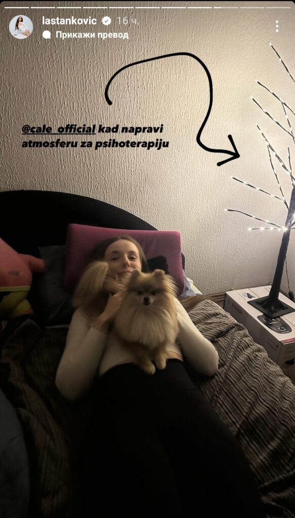 „Kad napravi atmosferu za psihoterapiju“, napisala je Lea uz sliku, pokazujući da Cale ume da stvori prijatno okruženje za razgovore o osećanjima. Takođe je istakla ulogu Caletovog psa, Žileta, koji je uvek uz nju kada joj je teško.