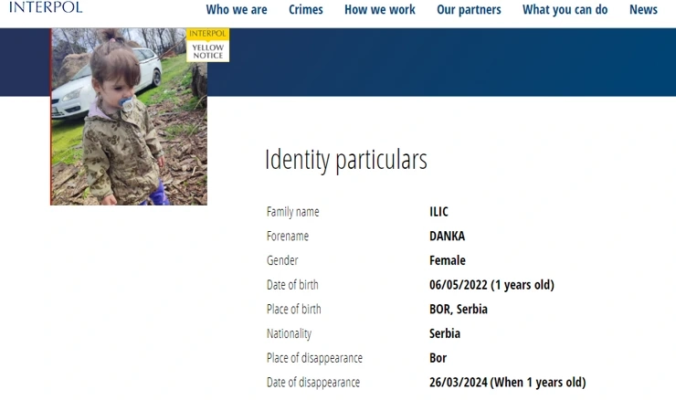 Interpol je u nedelju objavio međunarodnu potragu za dvogodišnjom devojčicom Dankom Ilić iz okoline Bora.