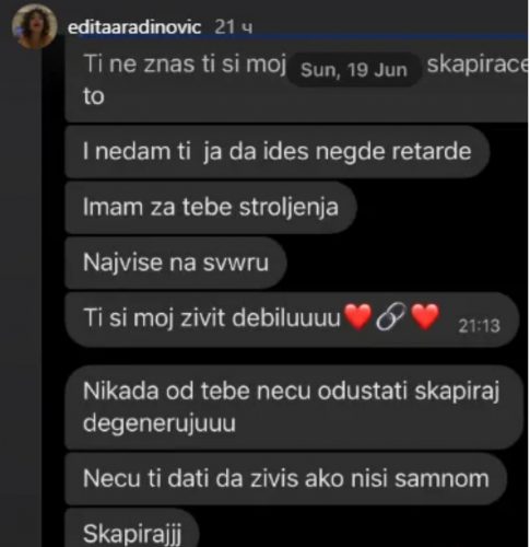 – Ti si moj život debilu. Nikada od tebe neću odustati, skapiraj to degeneriku. Neću ti dati da živiš, ako ni sa mnom. Ti si moj život. Obećavam ti najveću ljubav na svetu živote moj – napisao joj je zagonetni muškarac, a ona objavila njihovu prepisku, uz emotikon koji pokazuje da joj on nedostaje.