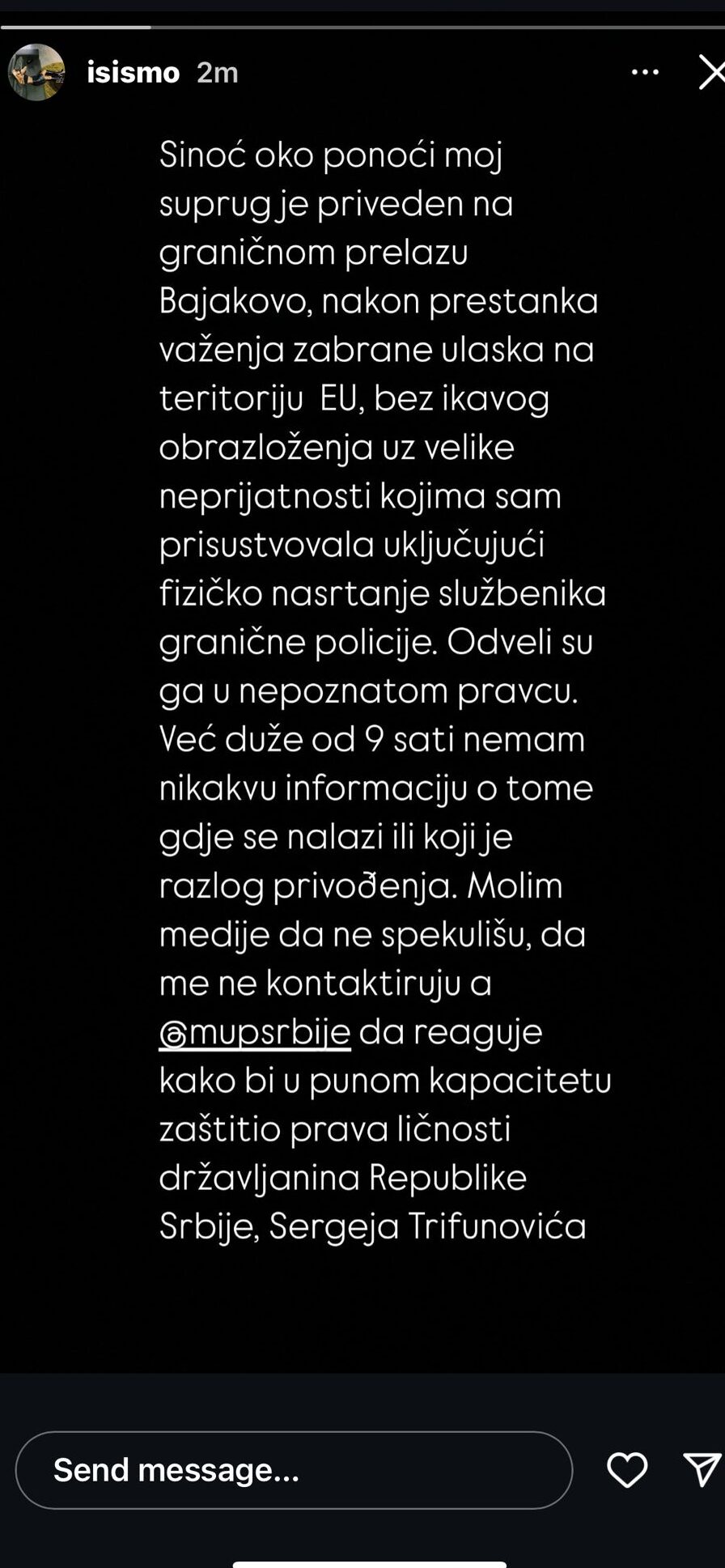 “Sinoc oko ponoci moj suprug je priveden na granicnom prelazu Bajakovo, nakon prestanka vazenja zabrane ulaska na teritoriju EU. Bez ikakvog obrazlozenja uz velike neprijatnosti kojima sam prisustvovala ukljucujuci fizicko nasrtanje sluzbenika granične policije. Odveli su ga u nepoznatom pravcu.”, napisala je i dodala: