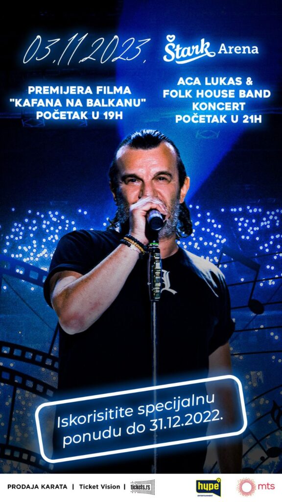 Požurite po svoje ulaznice i iskoristite specijalnu ponudu koja traje do 31. decembra 2022. godine na Ticket Vision prodajnim mestima i onlajn na tickets.rs za koncert legendarnog pevača Ace Lukasa i Folk Haus Benda sa početkom u 21 čas, kome prethodni premijera filma „Kafana na Balkanu“ koji je urađen po motivima iz Lukasovog života sa početkom u 19 časova.