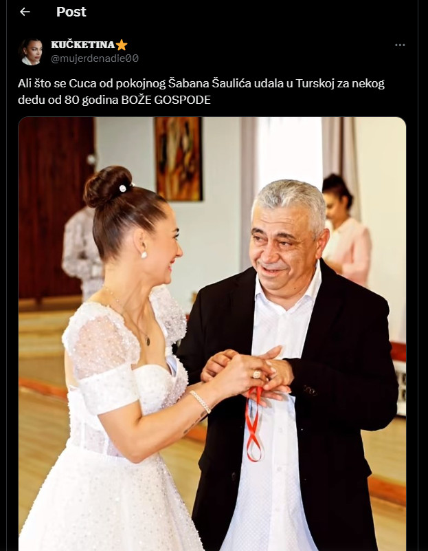 „Ali što se Cuca od pokojnog Šabana Šaulića udala u Turskoj za nekog dedu od 80 godina, Bože Gospode“, glasio je opis objave.