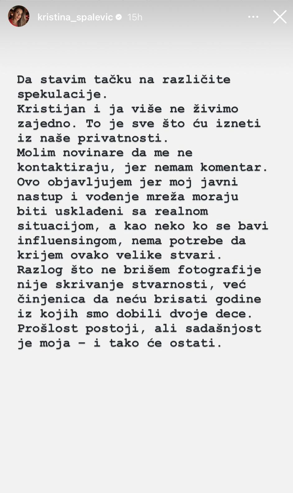 Nakon brojnih nagađanja, Kristina Spalević je putem Instagram storija potvrdila da je definitivno kraj između nje i Kristijana.