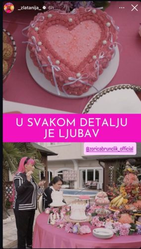 Vrhunac slatkog stola svakako je bila torta u obliku srca, ukrašena ručno pravljenim cvetovima i sitnim biserima od fondana, što je simbolično odražavalo ljubavnu priču slavnog para.