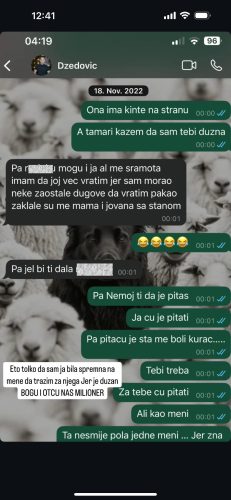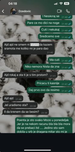 – Ćuti i ne kukaj, pare će doći na noge. Sredićeno sve.Ima neki neko dužan u Beogradu 2000 evra, samo da dobijem tu osobu. Pa ti javljam – napisala je Ermina.