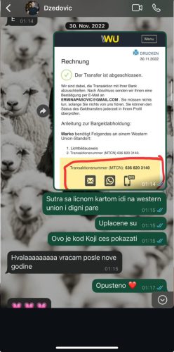 – Sutra sa ličnom kartom idi na western union i digni pare. Uplaćene su. Ovo je kod koji ćeš pokazati – napisala je Ermina.
