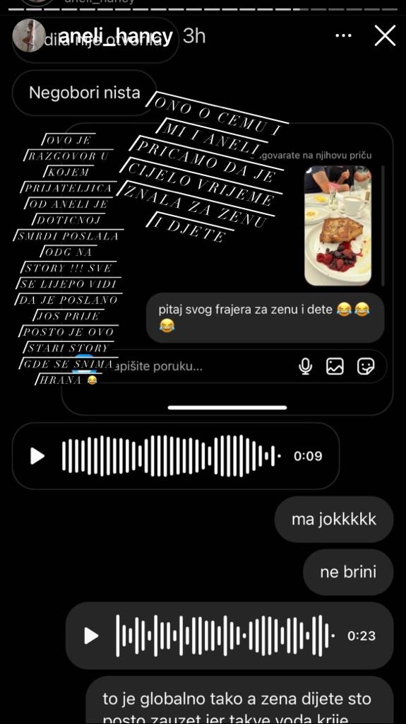 Na Instagram profilu Aneli Ahmić osvanule su nove šokantne tvrdnje o Staniji Dobrojević i Asminu Durdžiću. Tu se pominje kako je straleta i ranije bila opominjana da joj dečko ima ženu i dete, ali da on za to nije marila.