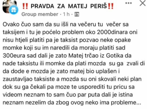 – Ovako čuo sam da u išli na večeru tu noć i da je nastao problem oko 2.000 dinara. Oni nisu hteli da plate taksisti račun, pa je taksista pozvao neke opasne momke, koji su im naredili da moraju da plate 300 evra. Ne znam, da li je Matej trčao iz „Gotika“ da nađe taksistu ili momke da plati. Možda su ga zvali da dođe, a možda je Matej bio uplašen i zato zaustavljao taksiste. Možda su skovali neki plan dok su ga čekali. Ovu priču možete uporediti sa videom. Ne znam, to sam čuo nekoliko puta i ne zna da li je istina. Ne znam da zbog ovoga možda nije imao problem – piše između ostalog u ovoj objavi na grupi „Pravda za Matej Periš“.