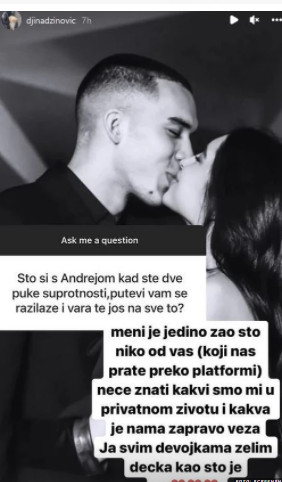 Na pitanje jednog od pratilaca koje glasi: „Što si sa Andrejom kada ste dve puke suprotnosti, putevi vam se razilaze i vara te još na sve to?“, ćerka pevača Harisa Džinovića je odgovorila: